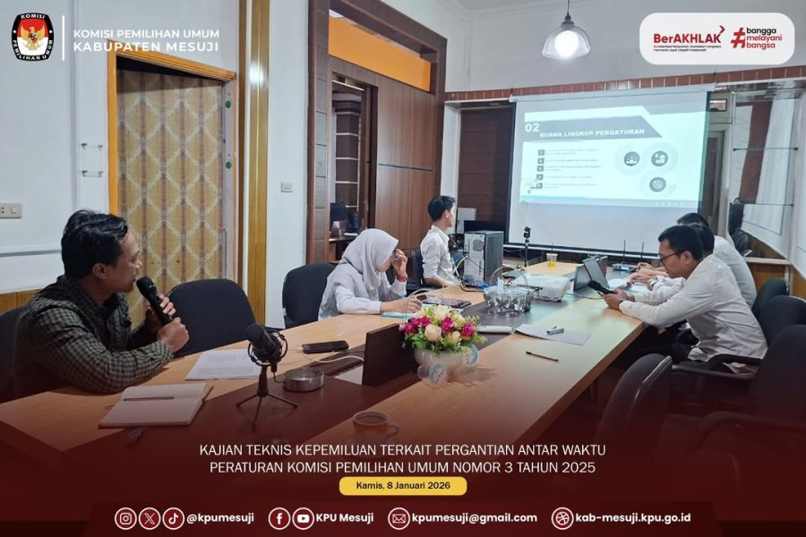 Komisi Pemilihan Umum (KPU) Kabupaten Mesuji melaksanakan Kajian Teknis Kepemiluan terkait Pergantian Antar Waktu (PAW). Kegiatan ini mengacu pada Peraturan Komisi Pemilihan Umum Nomor 3 Tahun 2025. Kajian berlangsung di ruang rapat Kantor KPU Kabupaten Mesuji pada Kamis, 8 Januari 2026. Forum diikuti jajaran pimpinan serta sekretariat KPU Kabupaten Mesuji. Sejak awal, suasana diskusi tampak serius dan penuh perhatian terhadap materi. Kajian teknis digelar untuk memperdalam pemahaman terhadap regulasi terbaru mengenai mekanisme PAW. KPU Kabupaten Mesuji menilai penguasaan aturan menjadi prasyarat penting dalam menjalankan kewenangan secara tepat. Peserta diarahkan untuk membaca ketentuan secara cermat dan menelaah pasal-pasal yang relevan. Fokus pembahasan menempatkan kepatuhan pada peraturan perundang-undangan sebagai landasan kerja. Kegiatan ini juga menjadi ruang pembelajaran bersama dalam penguatan kapasitas kelembagaan. Dalam sesi pemaparan materi, peserta membahas aspek prosedural dalam pelaksanaan PAW. Penekanan diberikan pada alur tahapan yang harus ditempuh sesuai ketentuan PKPU. “Kami ingin seluruh jajaran memahami langkah-langkah PAW secara utuh agar pelaksanaannya tertib dan tepat,” ujar salah satu pimpinan KPU Kabupaten Mesuji. Menurutnya, kejelasan prosedur akan membantu kerja kelembagaan berjalan lebih terukur. Pemaparan dilengkapi contoh situasi teknis yang kerap muncul dalam pelaksanaan. Selain prosedur, pembahasan menyoroti unsur administrasi yang wajib dipenuhi dalam proses PAW. Peserta menelaah kelengkapan dokumen, format, serta ketepatan pencatatan administrasi. Dalam forum, berbagai kemungkinan kendala administratif dibedah untuk menghindari kesalahan di kemudian hari. “Administrasi harus rapi sejak awal karena menjadi dasar penilaian legalitas proses,” kata perwakilan sekretariat KPU Kabupaten Mesuji. Pesan tersebut menguatkan pentingnya disiplin administrasi dalam setiap tahapan. Kajian juga mengulas implikasi teknis yang perlu diperhatikan saat PKPU Nomor 3 Tahun 2025 diterapkan. Peserta menimbang dampak aturan terhadap pola kerja internal dan koordinasi dengan pihak terkait. Diskusi berlangsung dinamis dengan sesi tanya jawab yang menajamkan pemahaman peserta. “Forum ini membuat kami lebih siap menghadapi situasi teknis yang membutuhkan keputusan cepat dan tepat,” ujar salah satu peserta kajian. Catatan hasil diskusi dihimpun sebagai bahan penguatan pelaksanaan tugas di lapangan. KPU Kabupaten Mesuji menegaskan komitmennya untuk senantiasa siap menjalankan tugas dan kewenangan sesuai aturan. Melalui kajian teknis ini, KPU mendorong kesamaan persepsi agar mekanisme PAW berjalan profesional dan akuntabel. KPU juga menekankan bahwa integritas menjadi pegangan utama dalam setiap keputusan kelembagaan. “Kami menjaga kepercayaan publik melalui kerja yang taat regulasi dan dapat dipertanggungjawabkan,” ujar pimpinan KPU Kabupaten Mesuji. Dengan penguatan pemahaman regulasi, KPU Kabupaten Mesuji berharap pelaksanaan PAW dapat berlangsung tertib dan berintegritas. (ali) ....