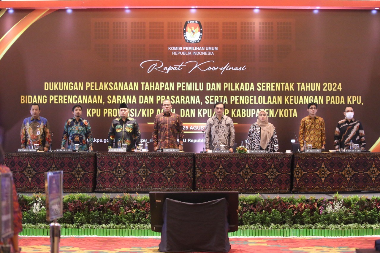 Jakarta, kpu.go.id - Ketua KPU Hasyim Asy’ari, Anggota KPU Yulianto Sudrajat, Betty Epsilon Idroos, Mochammad Afifuddin, August Mellaz, Parsadaan Harahap, dan Idham Holik bersama Sekretaris Jenderal KPU, Bernad Dermawan Sutrisno membuka kegiatan Rapat Koordinasi Dukungan Pelaksanaan Tahapan Pemilu dan Pemilihan Serentak Tahun 2024 Bidang Perencanaan, Sarana, dan Prasarana, serta Pengelolaan Keuangan Pada KPU Provinsi/KIP Aceh, dan KPU/KIP Kabupaten/Kota, di Nusa Dua Bali, Selasa (23/08/2022).
