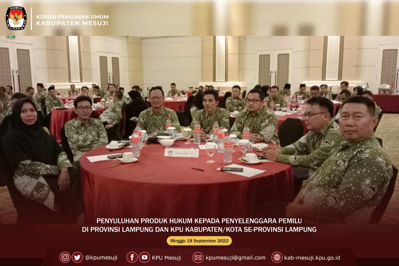 Komisi Pemilihan Umum (KPU) Kabupaten Mesuji mengikuti kegiatan Penyuluhan Produk Hukum yang diselenggarakan oleh KPU Provinsi Lampung di Hotel Swiss-Bell Bandar Lampung, Minggu (18/09/2022).