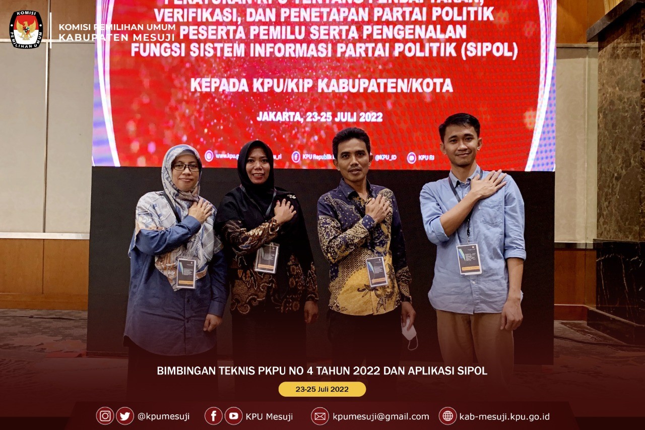 Komisi Pemilihan Umum Kabupaten Mesuji diwakili oleh Ketua Divisi Teknis Penyelenggaraan Imani, Ketua Divisi Perencanaan, Data dan Informasi Majeha, Kepala Sub Bagian Teknis Penyelenggaraan Pemilu, Partisipasi dan Hubungan Masyarakat Yuliza Fitrianti, dan Operasi Sistem Informasi Partai Politik (SIPOL) Dwi Apriyanto, mengikuti kegiatan Bimbingan Teknis (Bimtek) Peraturan Komisi Pemilihan Umum (PKPU) Nomor 4 Tahun 2022 tentang Pendaftaran, Verifikasi, dan Penetapan Peserta Pemilu serta Pengenalan SIPOL kepada KPU/KIP Kabupaten/Kota se-Indonesia yang dilaksanakan oleh KPU Republik Indonesia di Hotel Grand Sahid Jaya, Jakarta (23/07/2022 s.d 25/07/2022).