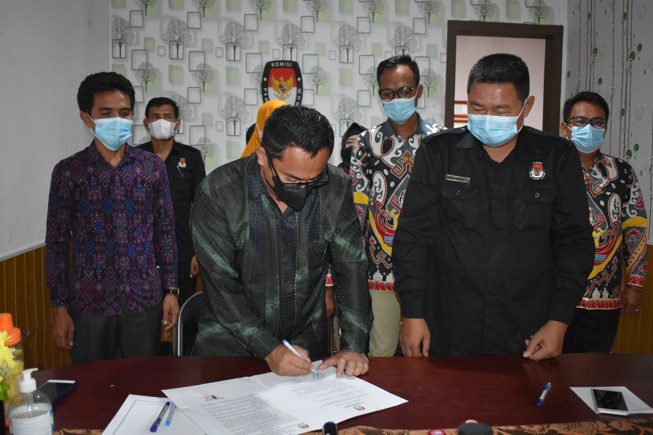 Penandatanganan dimulai dari ketua, sektetaris dan kabag sekretariat KPU Provinsi Lampung kemudian di ikuti oleh seluruh KPU Kabupaten/Kota se Provinsi Lampung.