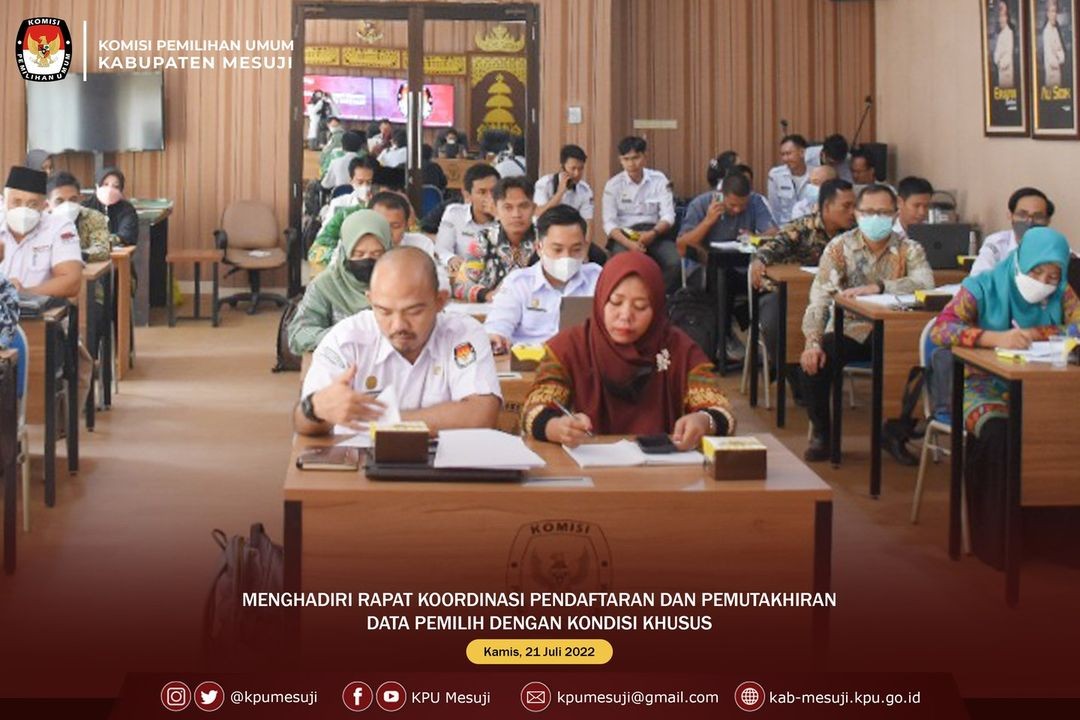 Komisi Pemilihan Umum (KPU) Kabupaten Mesuji mengikuti Rapat Koordinasi (Rakor) Pendaftaran dan Pemutakhiran Data Pemilih dengan Kondisi Khusus yang diselenggarakan oleh KPU Provinsi Lampung di Ruang Rapat Kantor KPU Provinsi Lampung, Kamis (21/07/2022).