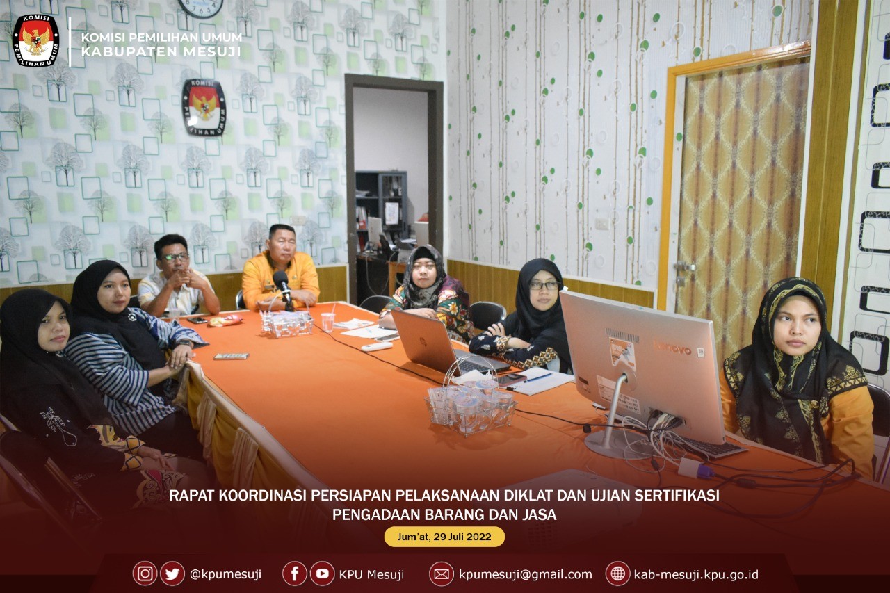 Komisi Pemilihan Umum (KPU) Kabupaten Mesuji mengikuti kegiatan Rapat Koordinasi Persiapan Pelaksanaan Diklat dan Ujian Sertifikasi Pengadaan Barang dan Jasa (PBJ) yang diselenggarakan oleh KPU Provinsi Lampung secara daring (dalam jaringan) di Ruang Rapat Kantor KPU Kabupaten Mesuji, Jum'at (29/07/22).