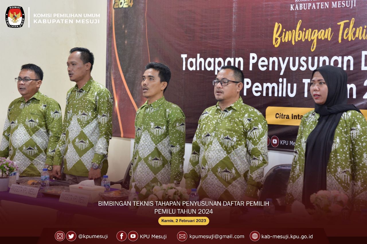 Komisi Pemilihan Umum (KPU) Kabupaten Mesuji melaksanakan Bimbingan Teknis (Bimtek) Penyusunan Daftar Pemilih untuk Pemilu tahun 2024 kepada Panitia Pemilihan Kecamatan (PPK) se- Kabupaten Mesuji di RM. Citra Intan Kecamatan Simpang Pematang, Kamis (02/02/2023).
