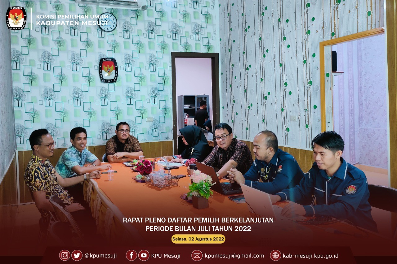 Komisi Pemilihan Umum (KPU) Kabupaten Mesuji melaksanakan Rapat Pleno Pemutakhiran Data Pemilih Berkelanjutan (PDPB) Periode bulan Juli tahun 2022 di ruang rapat KPU Kabupaten Mesuji, Selasa (02/08/2022).