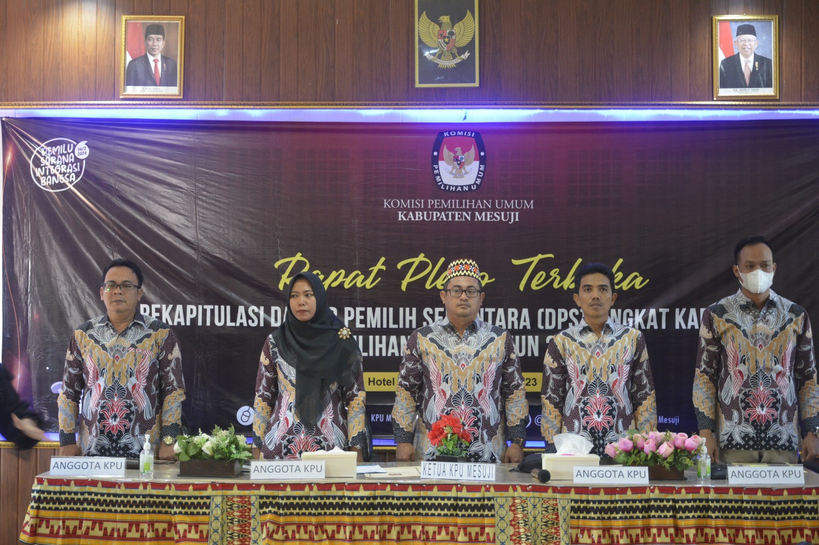 Komisi Pemilihan Umum (KPU) Kabupaten Mesuji melaksanakan Rapat Pleno Terbuka Rekapitulasi Daftar Pemilih Sementara (DPS) Tingkat Kabupaten Mesuji Untuk Pemilihan Umum Tahun 2024 di Hotel Adzam, Desa Berasan Makmur, Kecamatan Tanjung Raya, Kabupaten Mesuji, Rabu (05/04/2023 ).