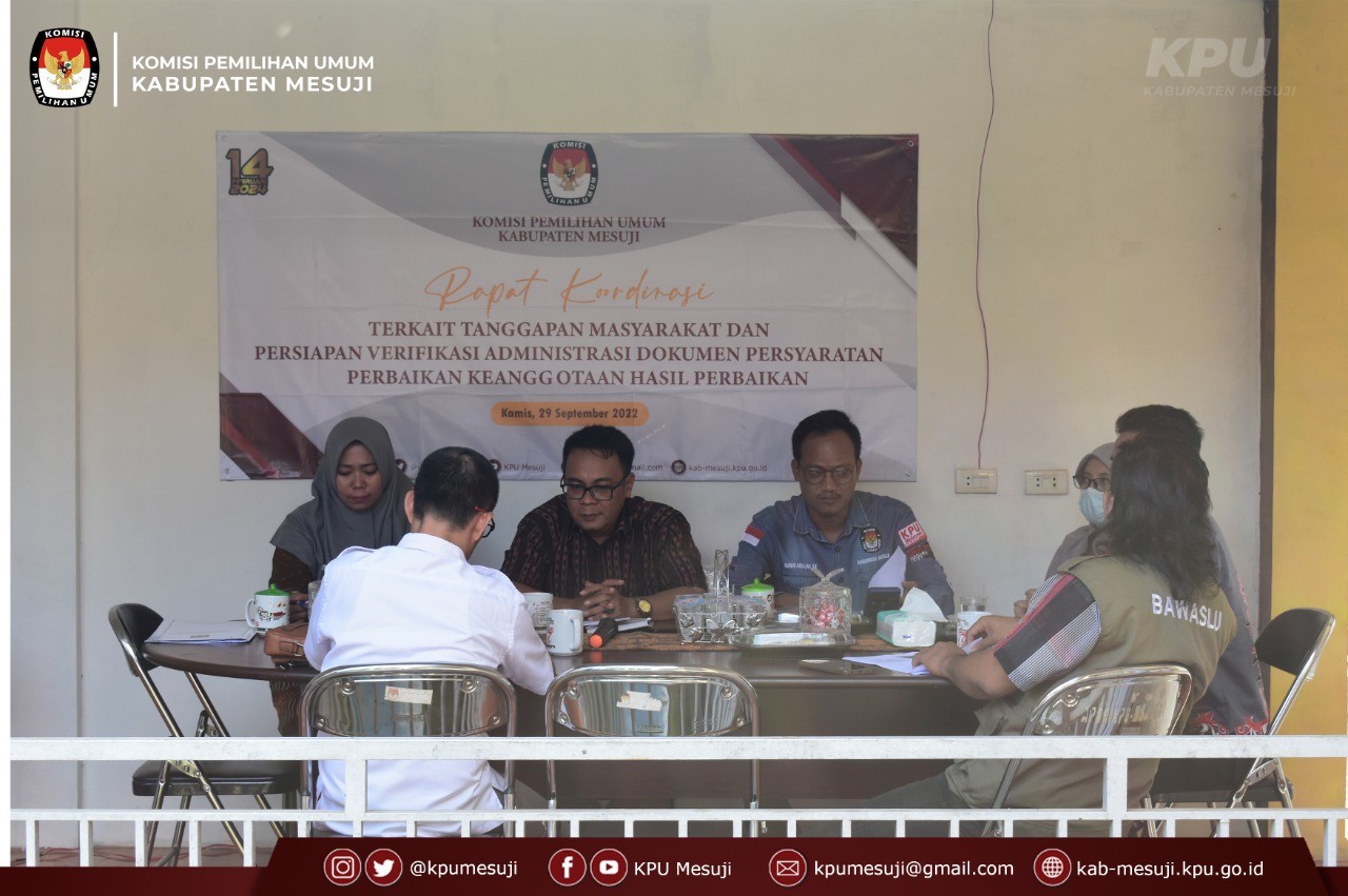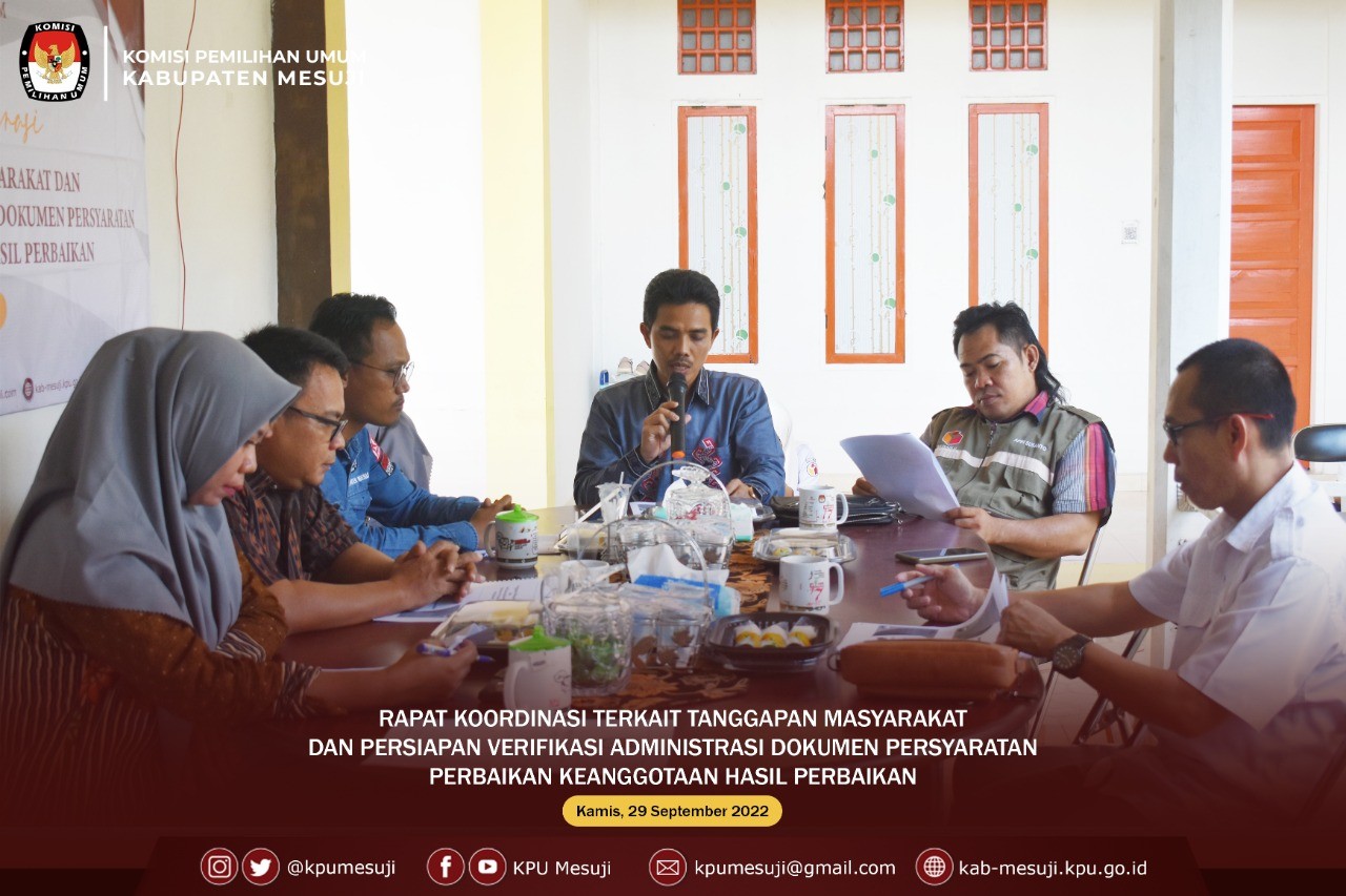 Komisi Pemilihan Umum (KPU) Kabupaten Mesuji melaksanakan Rapat Koordinasi terkait tanggapan masyarakat dan persiapan verifikasi administrasi dokumen persyaratan perbaikan keanggotaan partai politik hasil perbaikan bersama Bawaslu Kabupaten Mesuji di kantor KPU Kabupaten Mesuji, Kamis (29/09/2022).