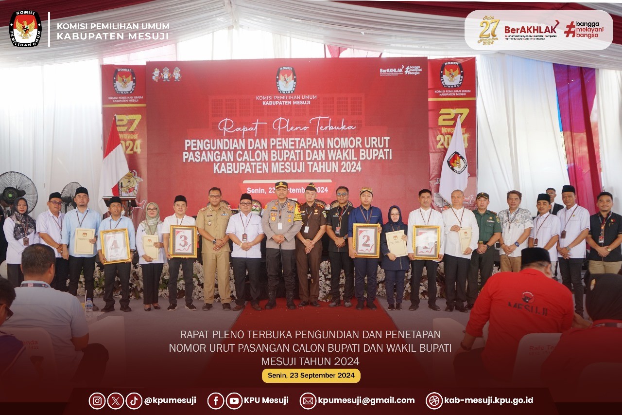 Komisi Pemilihan Umum Kabupaten Mesuji melaksanakan Rapat Pleno Terbuka Pengundian dan Penetapan Nomor Urut Pasangan Calon Bupati dan Wakil Bupati Mesuji Tahun 2024 di Kantor KPU Kabupaten Mesuji, Senin (23/09/2024).