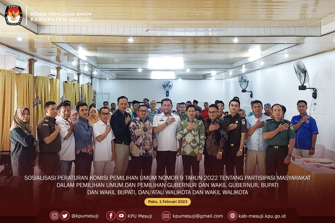 Komisi Pemilihan Umum (KPU) Kabupaten Mesuji melaksanakan Sosialisasi Peraturan Komisi Pemilihan Umum (PKPU) Nomor 9 Tahun 2022 tentang Partisipasi Masyarakat pada Pemilihan Umum, Pemilihan Gubernur dan Wakil Gubernur, Bupati dan Wakil Bupati dan/atau Walikota dan Wakil Walikota kepada stakeholder di Hotel D’ Pilda Kecamatan Simpang Pematang, Rabu (1/02/2023).