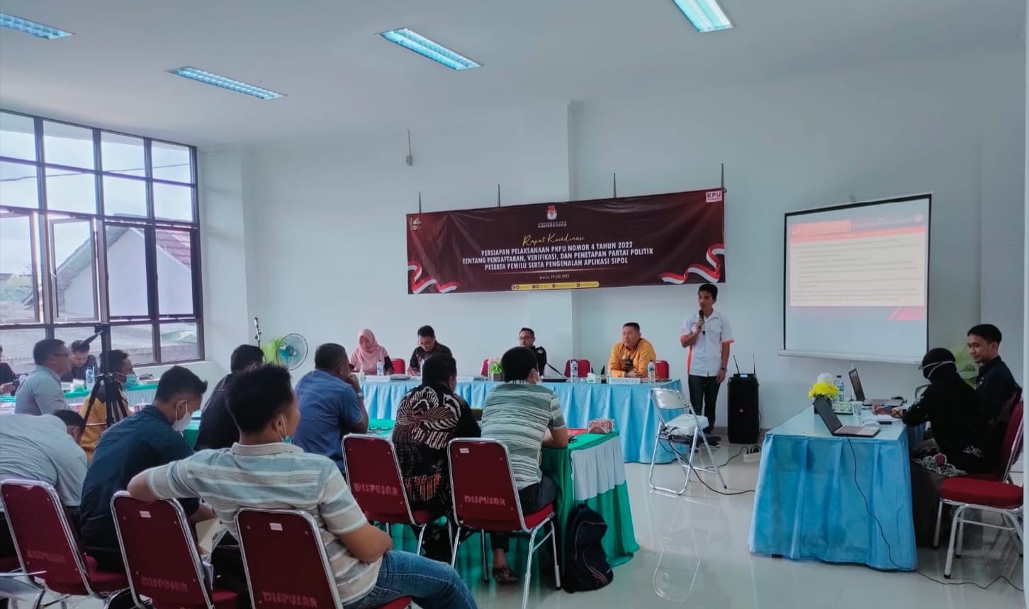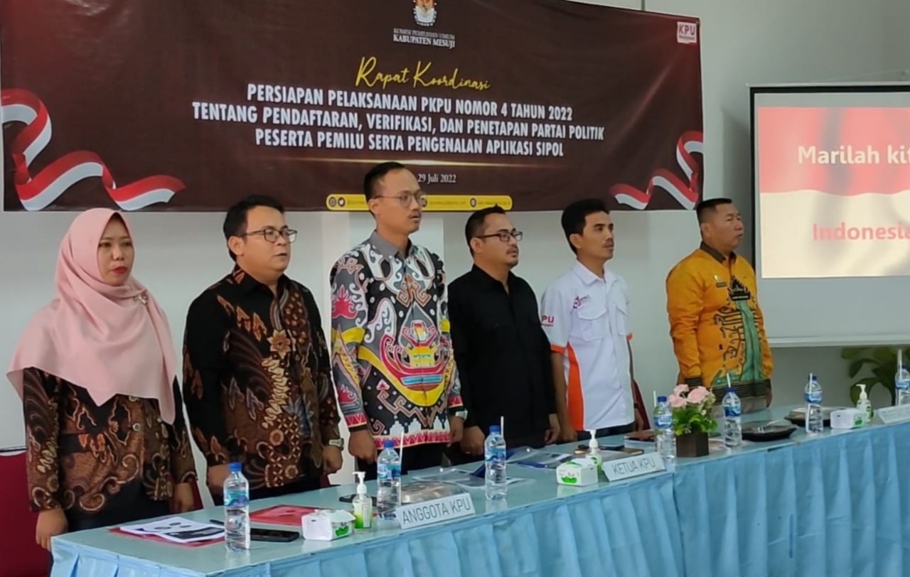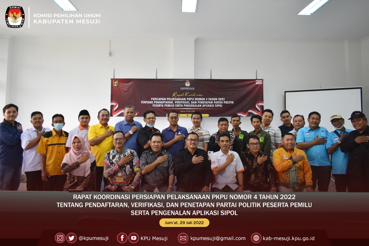 Komisi Pemilihan Umum Kabupaten Mesuji melaksanakan Rapat Koordinasi (Rakor) Persiapan Pelaksanaan Peraturan Komisi Pemilihan Umum (PKPU) Nomor 4 Tahun 2022 tentang Pendaftaran, Verifikasi dan Penetapan Partai Politik peserta Pemilu Anggota Dewan Perwakilan Rakyat (DPR) dan Dewan Perwakilan Rakyat Daerah (DPRD) di Aula Perpustakaan Kabupaten Mesuji, Desa Brabasan, Jumat 29/7/2022.