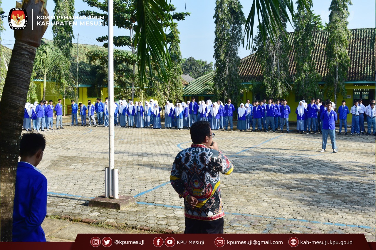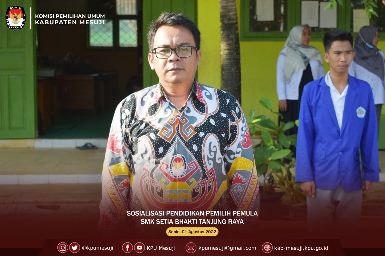 Ketua Divisi Sosialisasi, Pendidikan Pemilih, Partisipasi Masyarakat dan Sumber Daya Manusia (Sosdiklih, Parmas & SDM) Komisi Pemilihan Umum (KPU) Kabupaten Mesuji Eko Sumarsono, ST melakukan kunjungan sekolah dalam rangka memberikan Sosialisasi dan Pendidikan Pemilih terkait Pemilu dan Pemilihan Serentak Tahun 2024 kepada Pemilih Pemula di SMK Setia Bhakti, Desa Brabasan, Kecamatan Tanjung Raya Kabupaten Mesuji, Senin (01/08/2022).