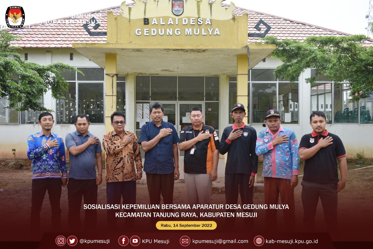 Komisi Pemilihan Umum (KPU) Kabupaten Mesuji melakukan Sosialisasi tahapan Pemilu dan Pemilihan serentak tahun 2024 kepada perangkat Desa di Desa Gedung Mulya Kecamatan Tanjung Raya, Kabupaten Mesuji, Rabu (14/09/2022).