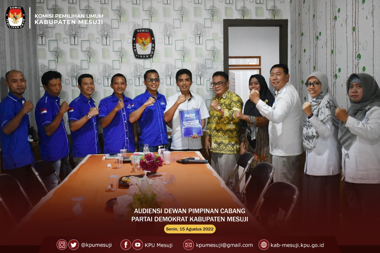 Komisi Pemilihan Umum (KPU) Kabupaten Mesuji menerima audiensi sekaligus penyerahan SK pengurus baru periode 2022-2027 dari Dewan Pimpinan Cabang (DPC) Partai Demokrat Kabupaten Mesuji, Senin (15/08/2022).