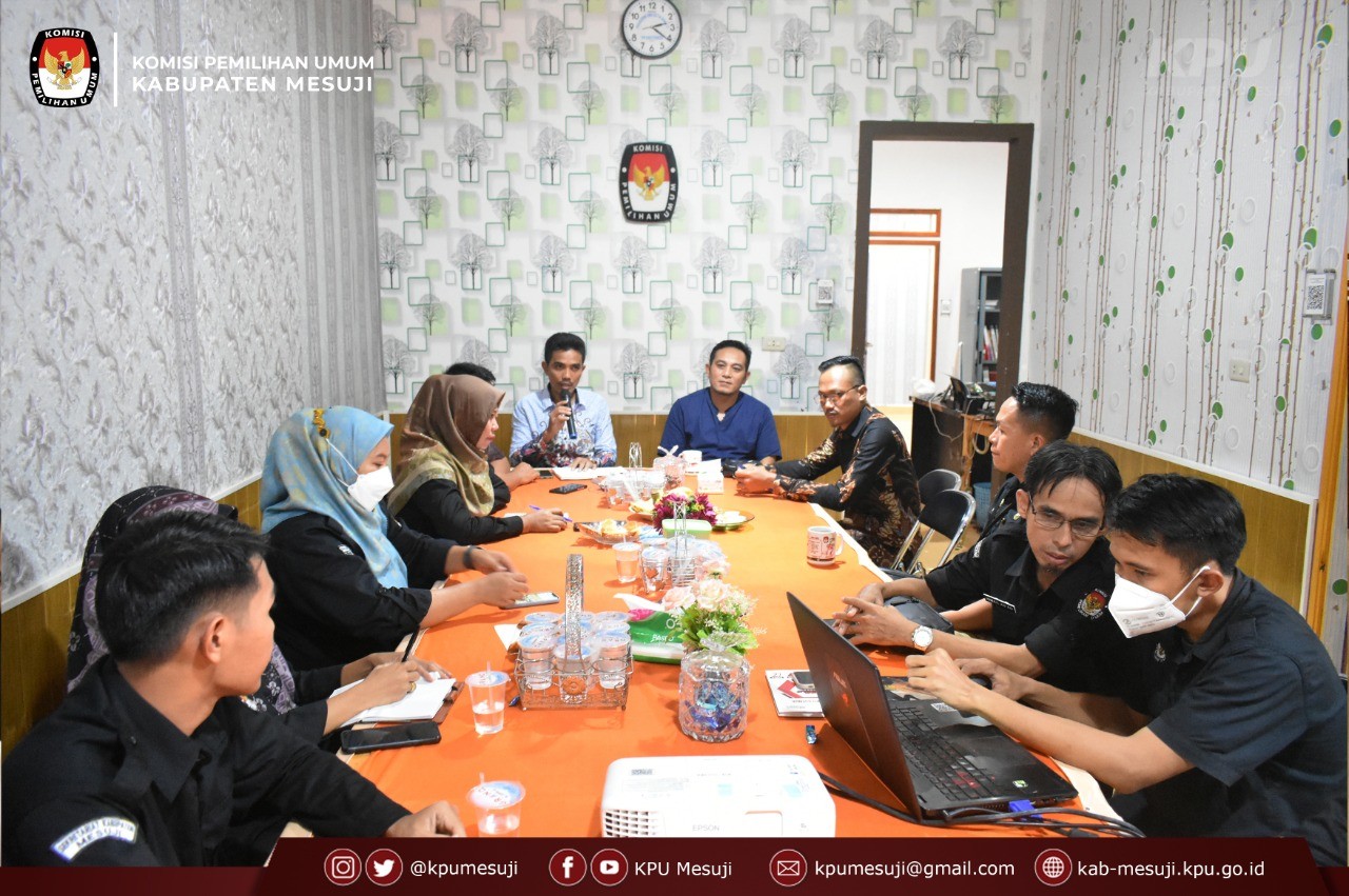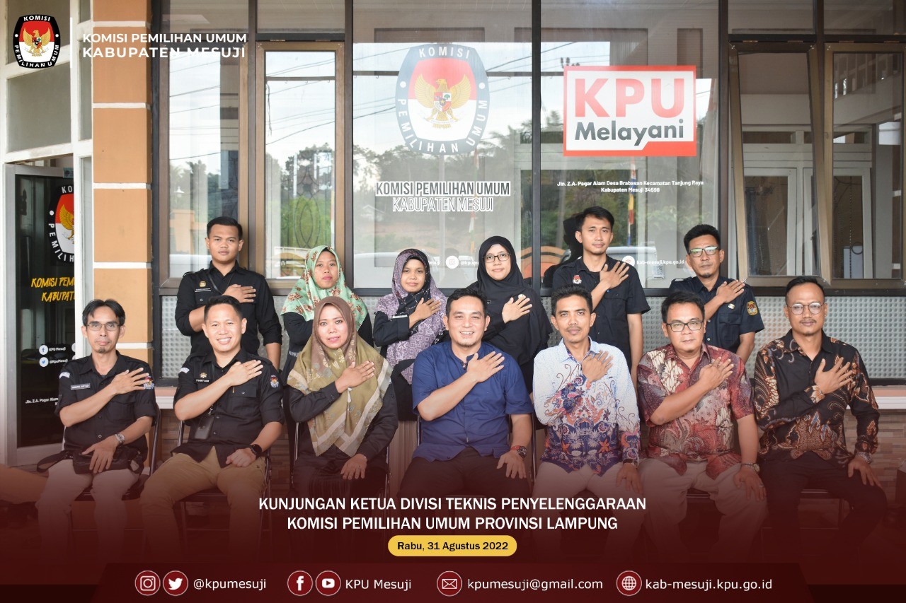 Kunjungan tersebut di sambut oleh seluruh komisioner KPU Kabupaten Mesuji, Sekretaris KPU Kabupaten Mesuji, kasubbag dan staf KPU Kabupaten Mesuji.