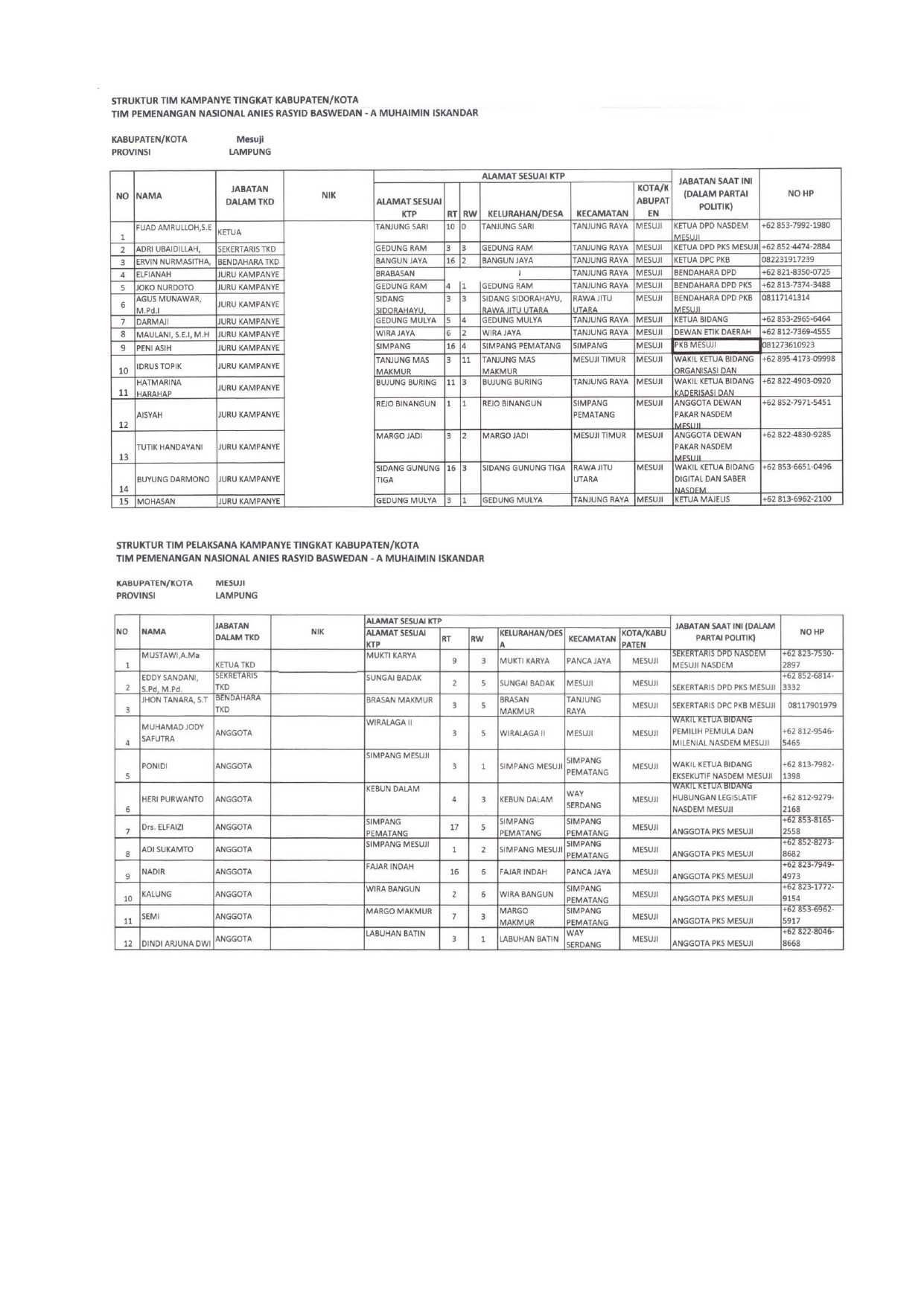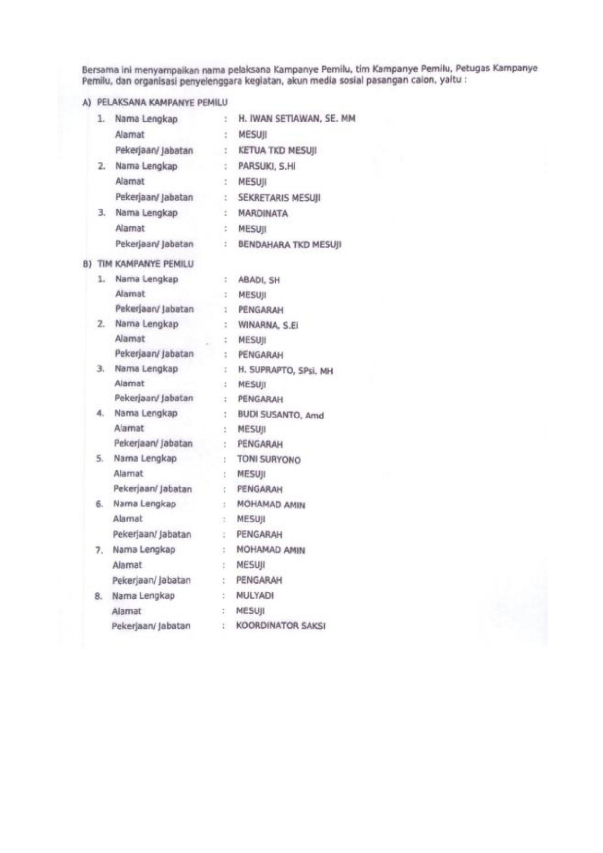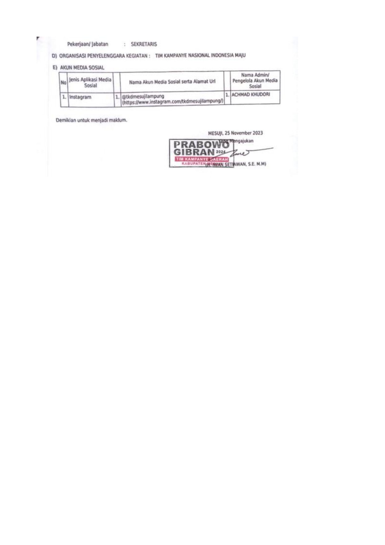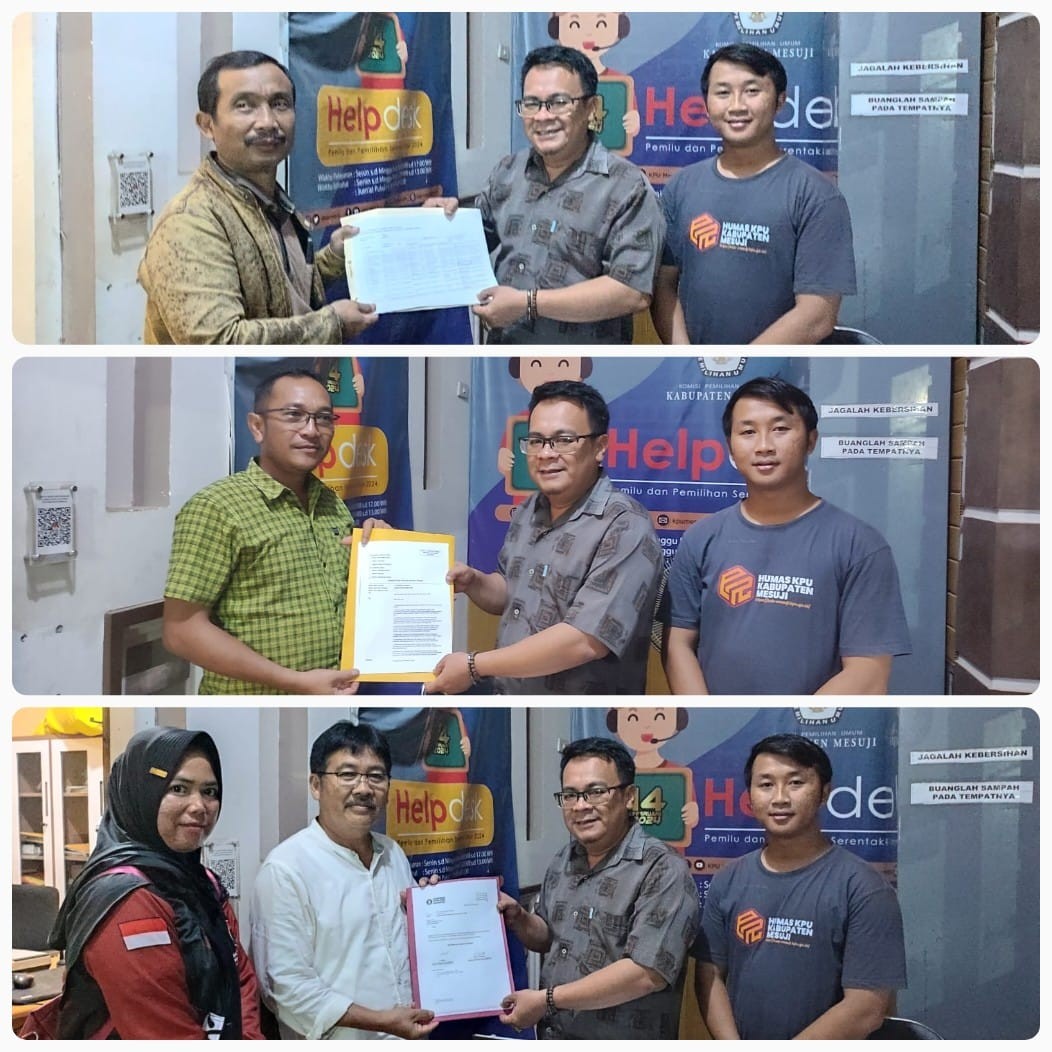 Komisi Pemilihan Umum (KPU) Kabupaten Mesuji menerima pendaftaran Tim Kampanye Daerah Pasangan Calon (Paslon) Presiden dan Wakil Presiden pada Pemilu tahun 2024 tingkat kabupaten Mesuji, Sabtu (25/11/2023).