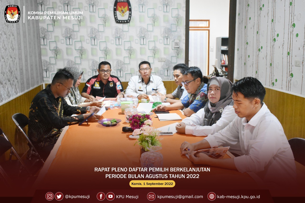 Komisi Pemilihan Umum Kabupaten Mesuji melaksanakan Rapat Pleno Pemutakhiran Data Pemilih Berkelanjutan (DPB) periode bulan Agustus Tahun 2022 di Ruang Rapat Kantor KPU Kabupaten Mesuji, Kamis (01/09/2022).