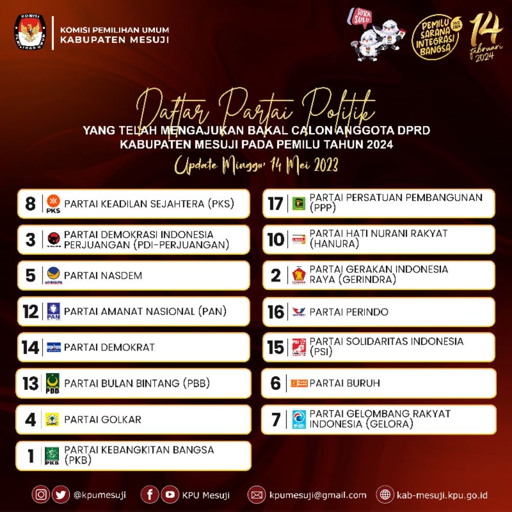 Dari 18 Partai Politik Nasional peserta Pemilu Tahun 2024, hanya 15 Parpol yang menyampaikan pengajuan bakal calon anggota DPRD Kabupaten Mesuji yaitu Partai Keadilan Sejahtera, PDI Perjuangan, Partai Nasdem, Partai Amanat Nasional, Partai Demokrat, Partai Bulan Bintang, Partai Golkar, Partai Kebangkitan Bangsa, Partai Persatuan Pembangunan, Partai Hanura, Partai Gerindra, Partai Perindo, Partai Solidaritas Indonesia, Partai Buruh dan Partai Gelora.