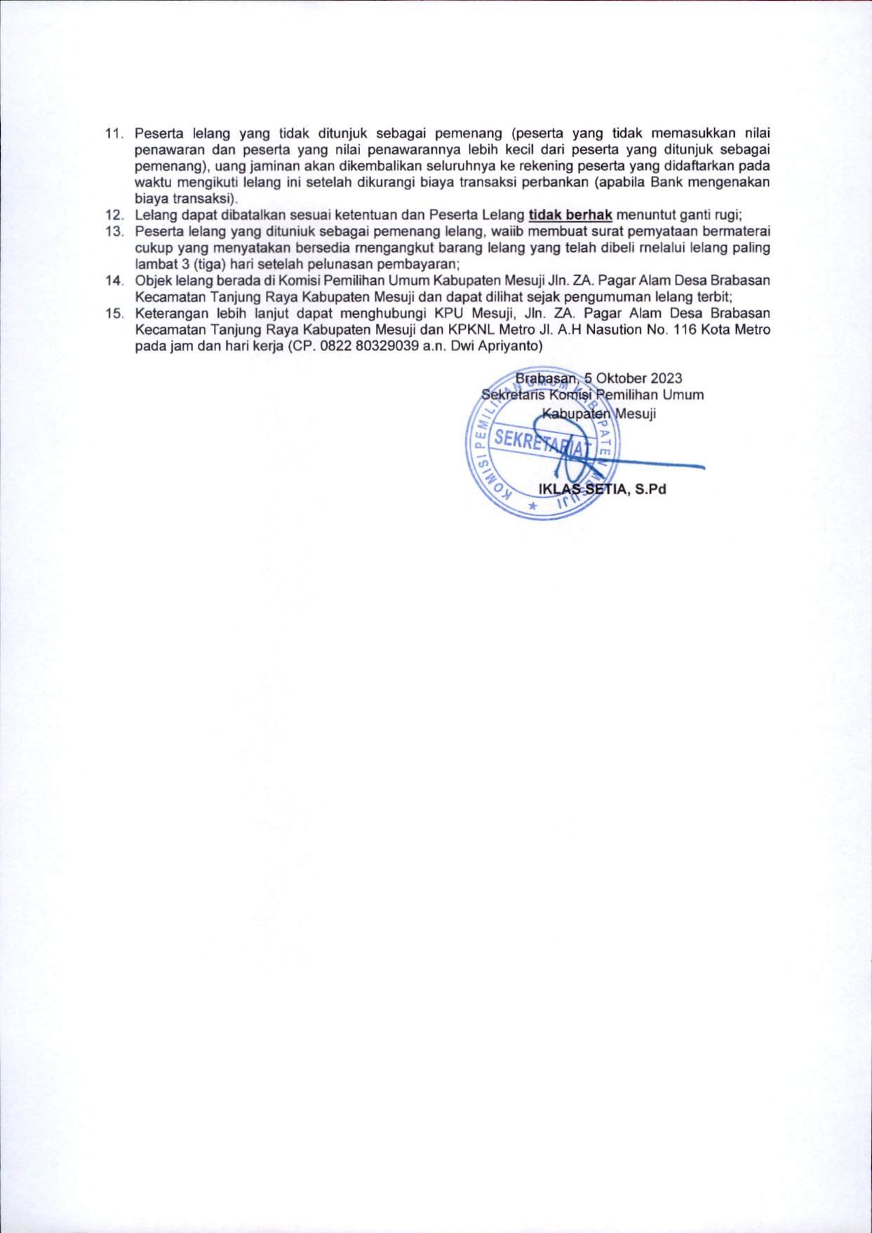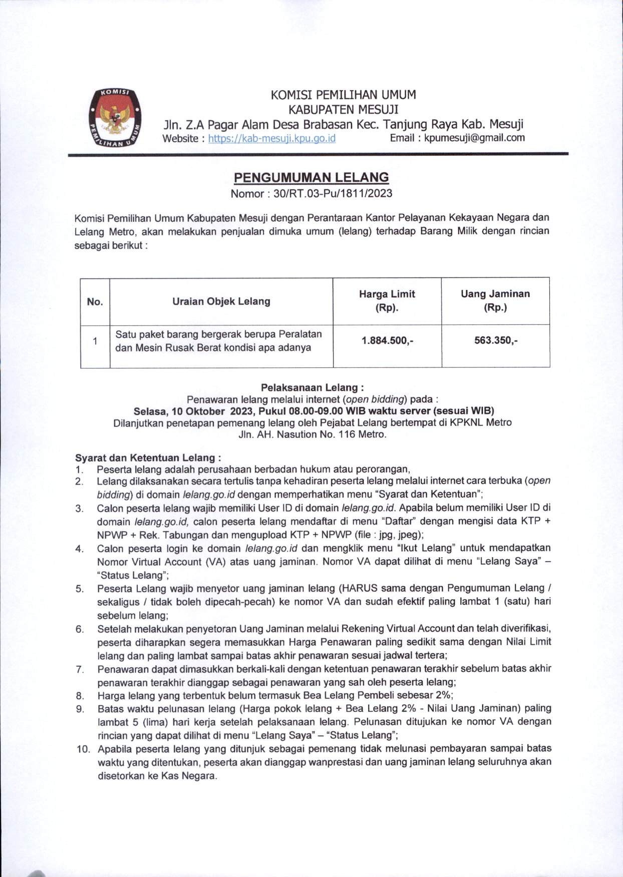 PENGUMUMAN LELANG PERALATAN DAN MESIN Kamis, 05 Oktober 2023 00:00 103 PENGUMUMAN LELANG PERALATAN DAN MESIN DAPAT DI DOWNLOAD DI SINI Bagikan: Dilihat 103 Kali.