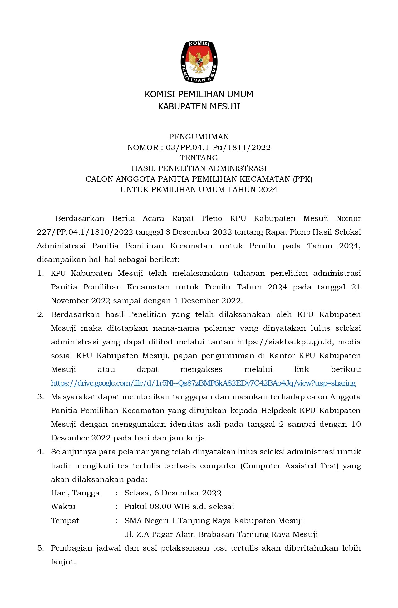 Download di sini PENGUMUMAN TENTANG HASIL PENELITIAN ADMINISTRASI CALON ANGGOTA PANITIA PEMILIHAN KECAMATAN (PPK) UNTUK PEMILIHAN UMUM TAHUN 2024