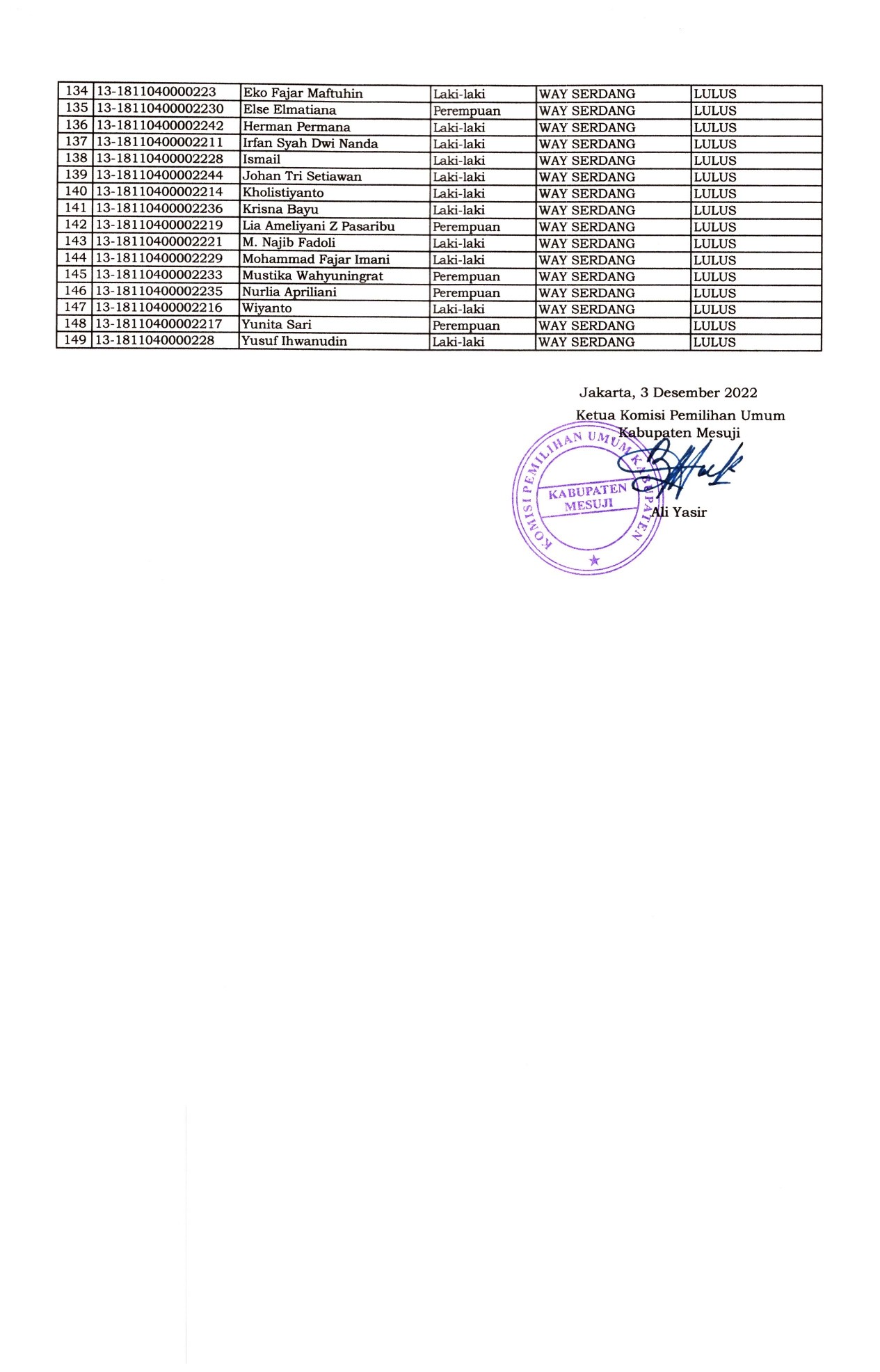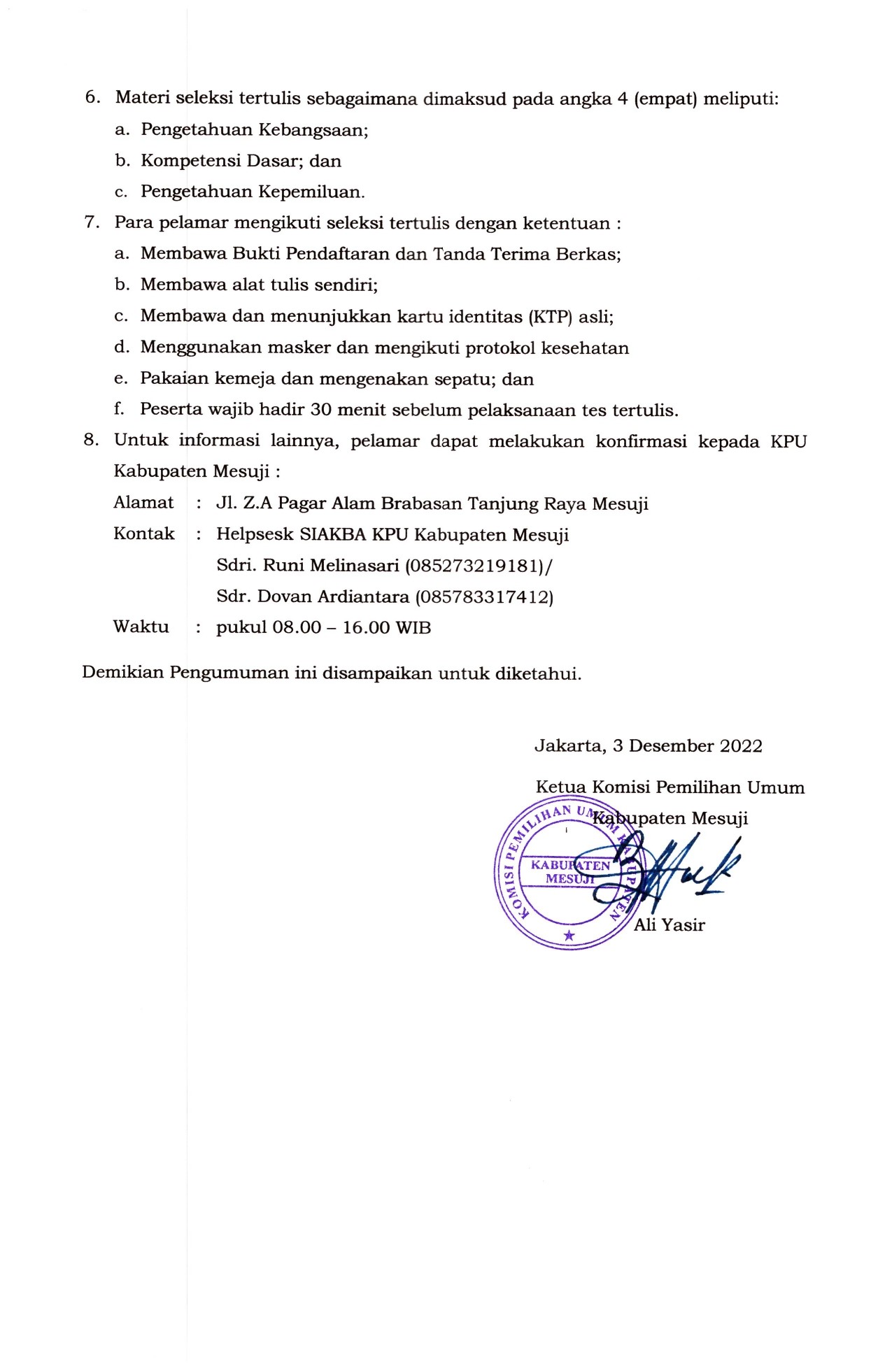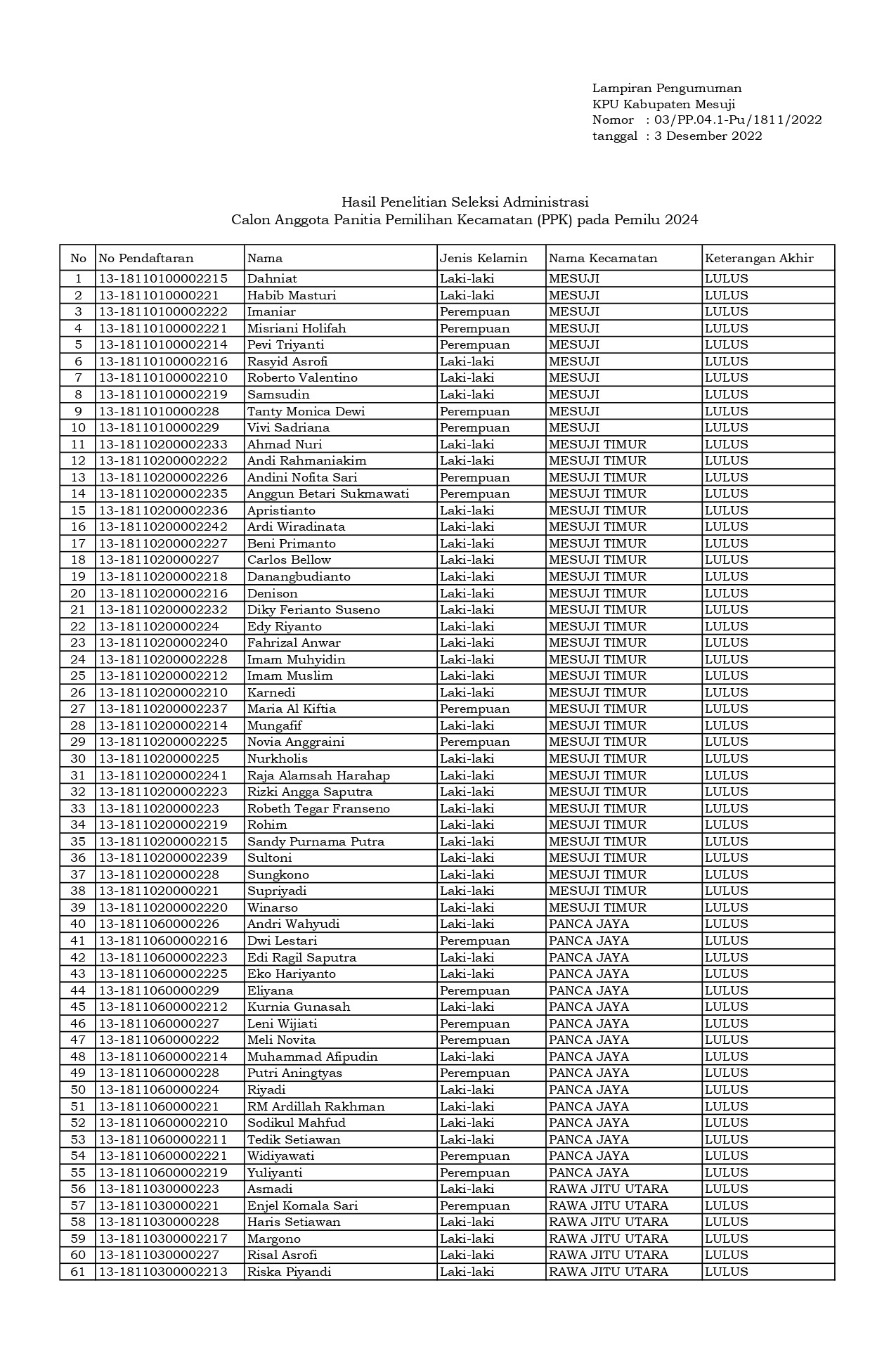 PENGUMUMAN TENTANG HASIL PENELITIAN ADMINISTRASI CALON ANGGOTA PANITIA PEMILIHAN KECAMATAN (PPK) UNTUK PEMILIHAN UMUM TAHUN 2024