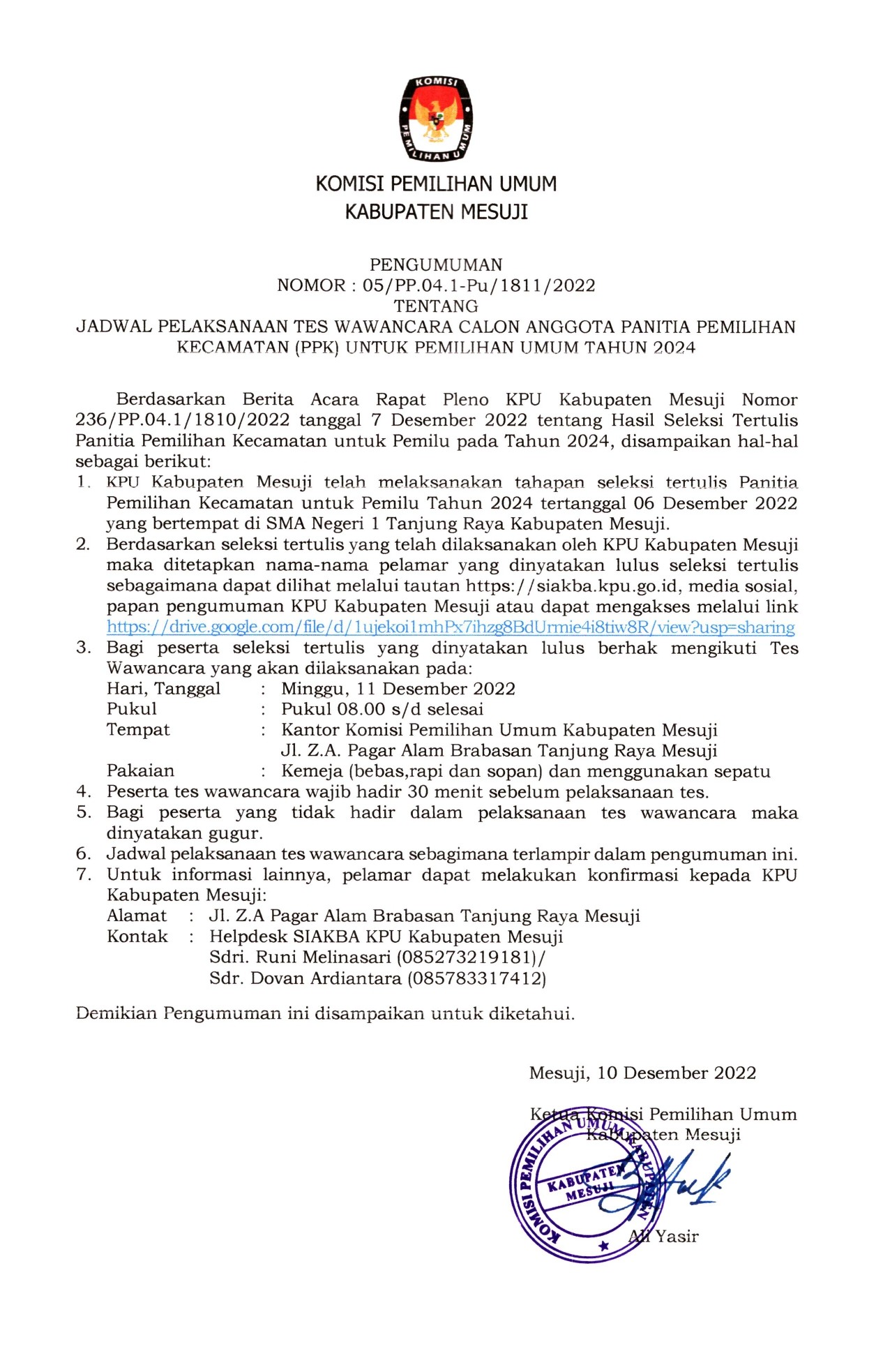 Download Pengumuman tentang Jadwal Pelaksanaan Tes Wawancara Calon Anggota PPK di sini.