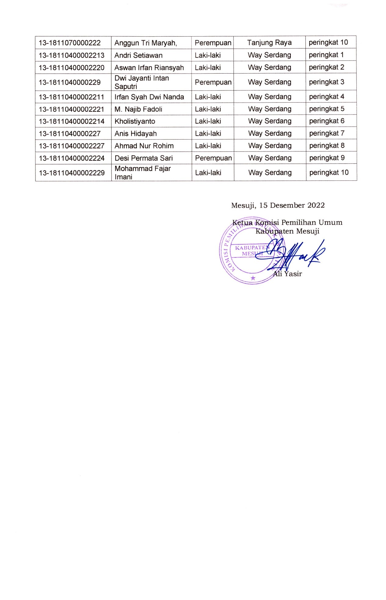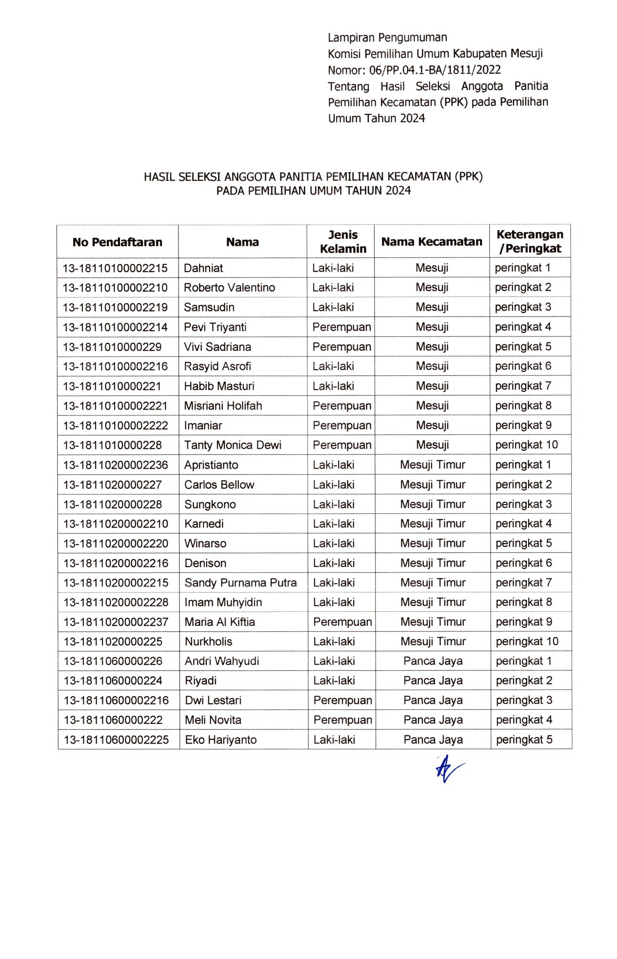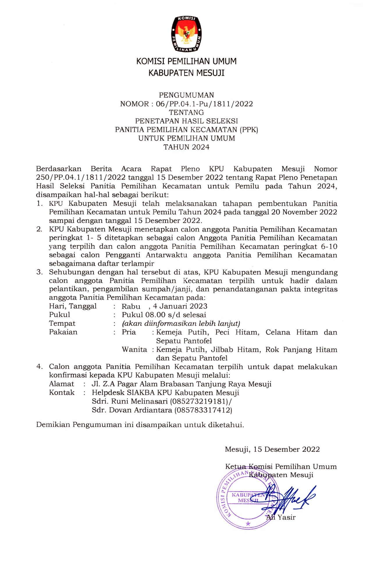 PENGUMUMAN TENTANG PENETAPAN HASIL SELEKSI PPK UNTUK PEMILIHAN UMUM TAHUN 2024 Kamis, 15 Desember 2022 00:00 474 DOWNLOAD PENGUMUMAN TENTANG PENETAPAN HASIL SELEKSI PPK UNTUK PEMILIHAN UMUM TAHUN 2024 di sini. Bagikan: Dilihat 474 Kali.