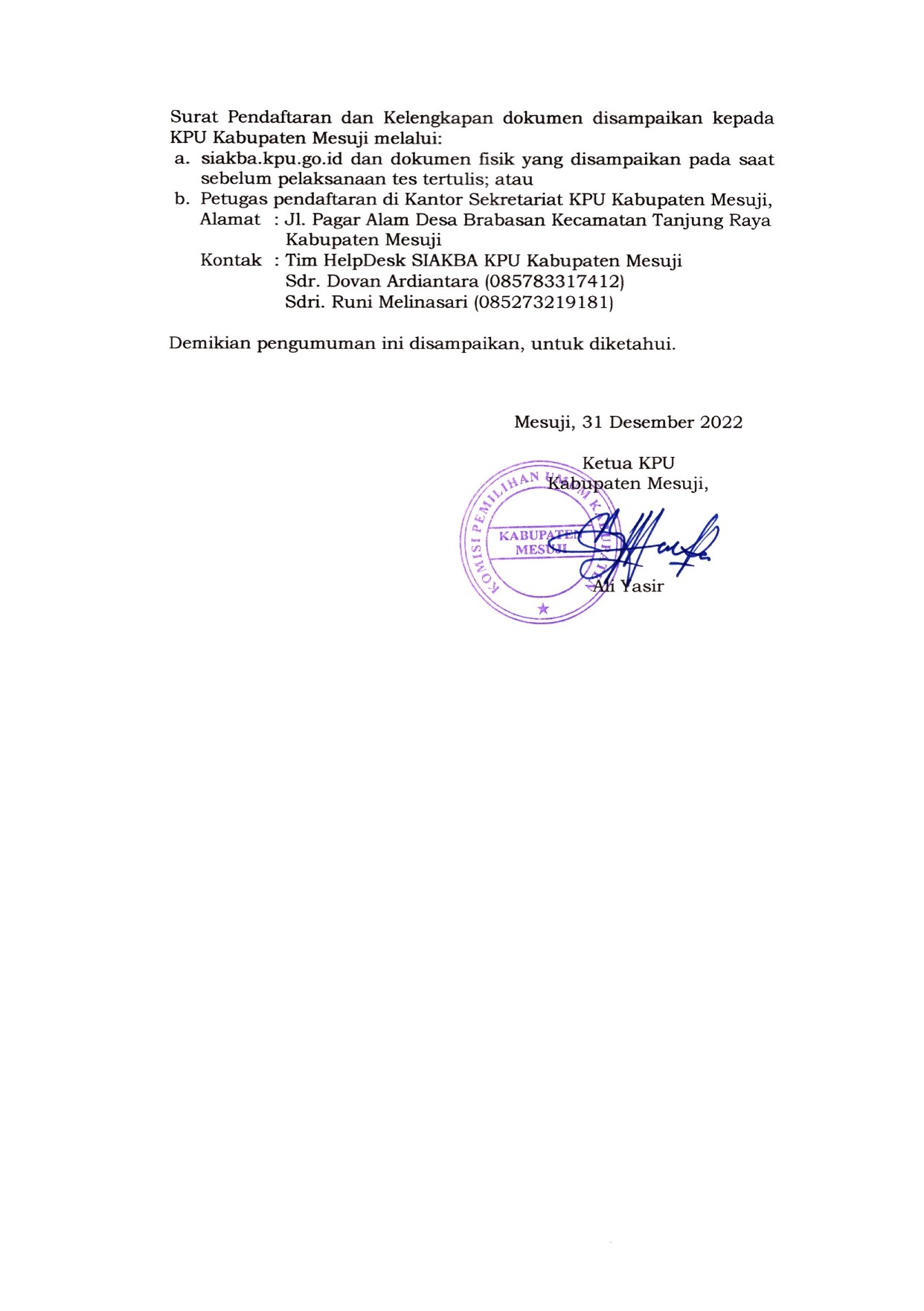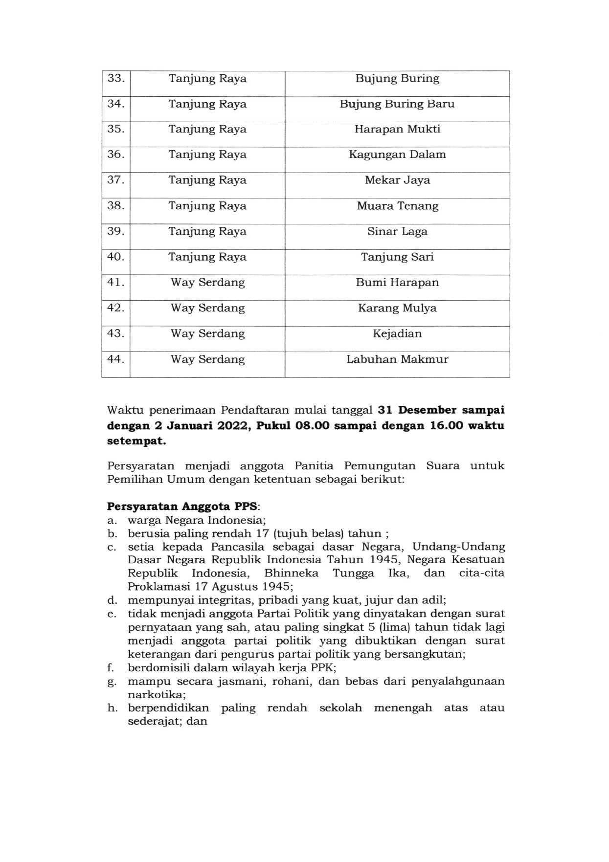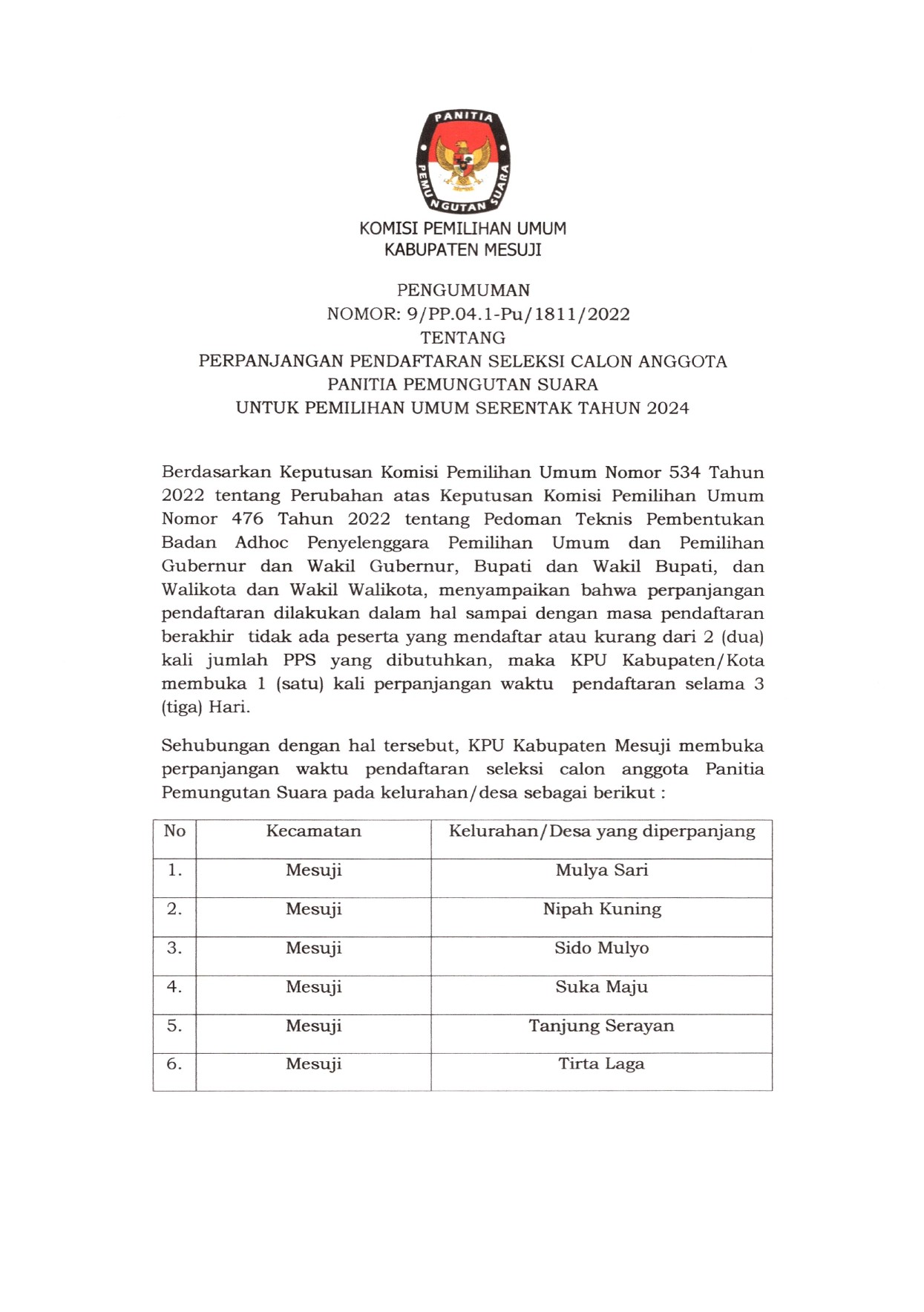 Pengumuman Tentang Perpanjangan Pendaftaran Seleksi Calon Anggota PPSUntuk Pemilihan Umum Tahun 2022