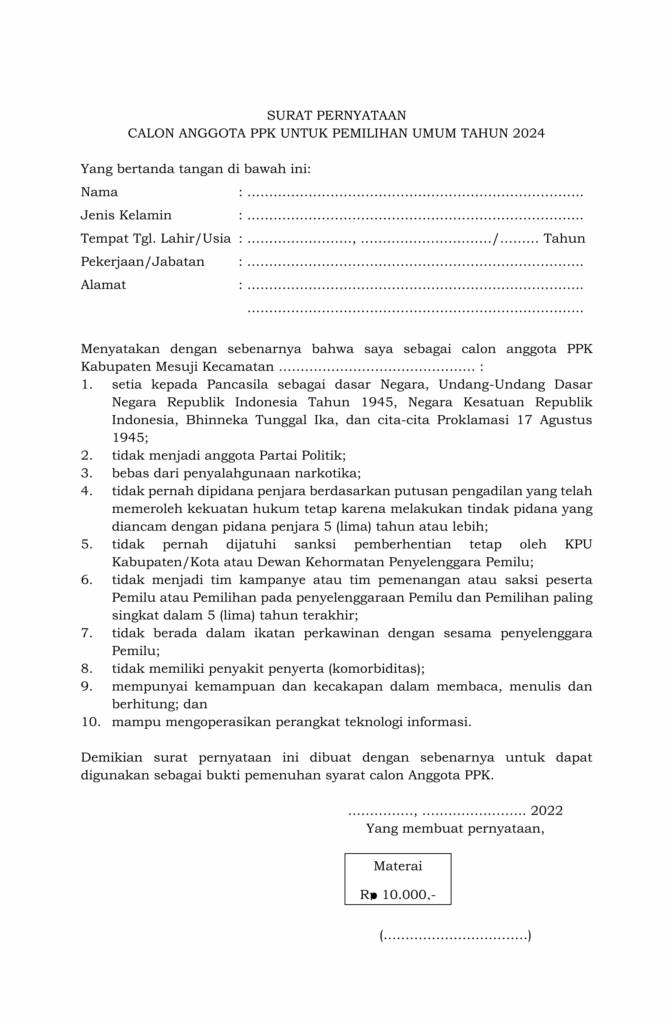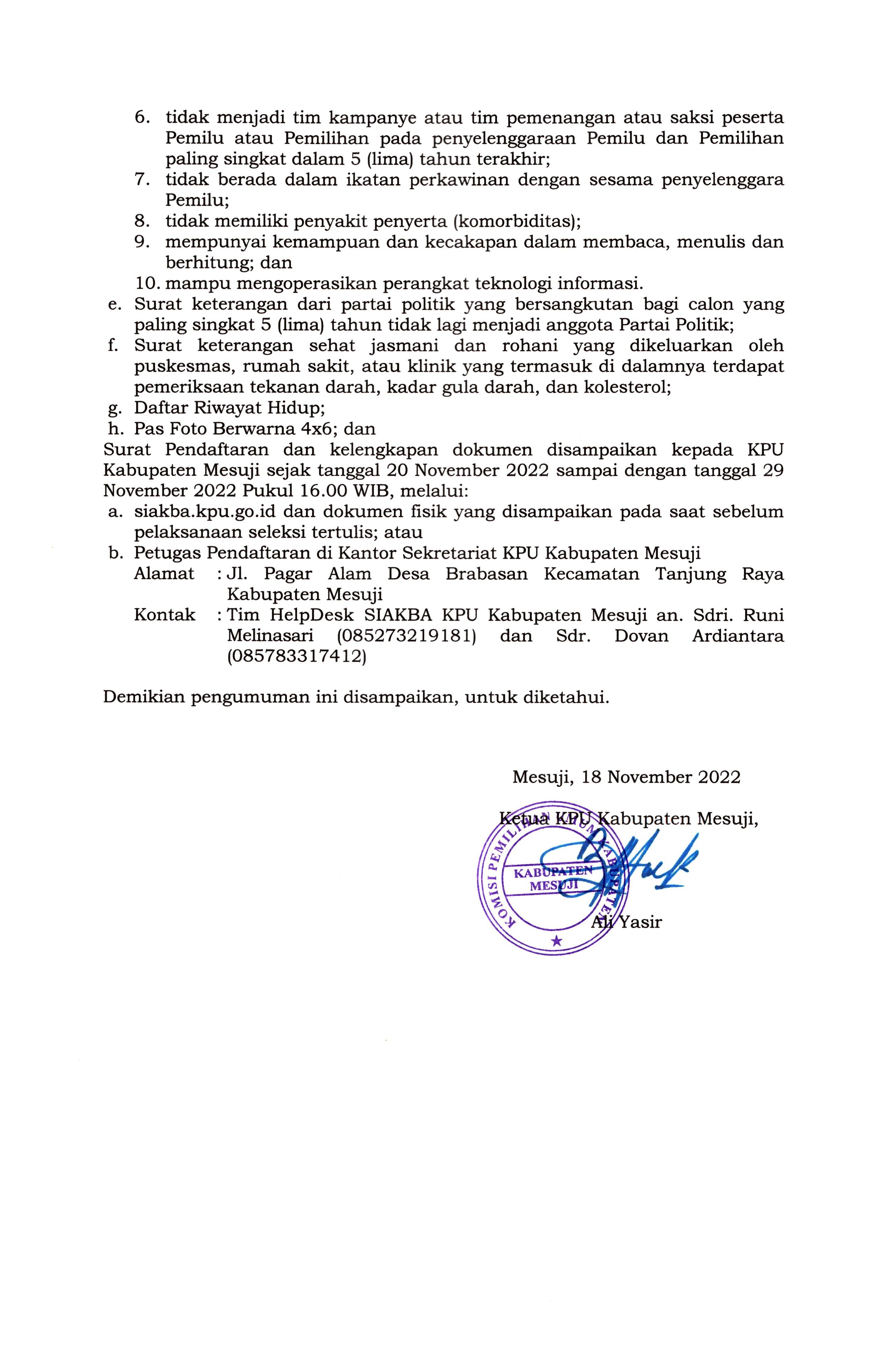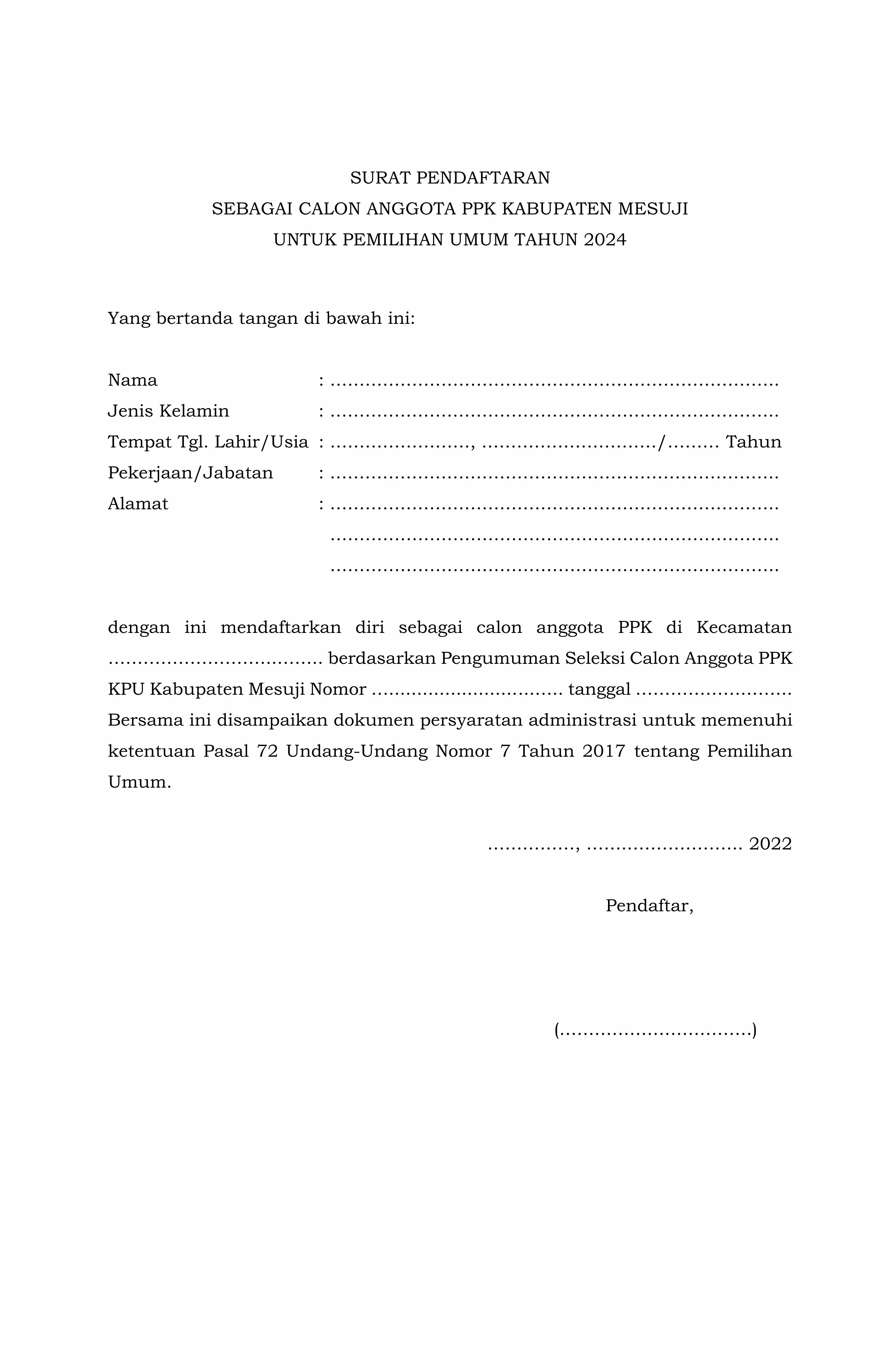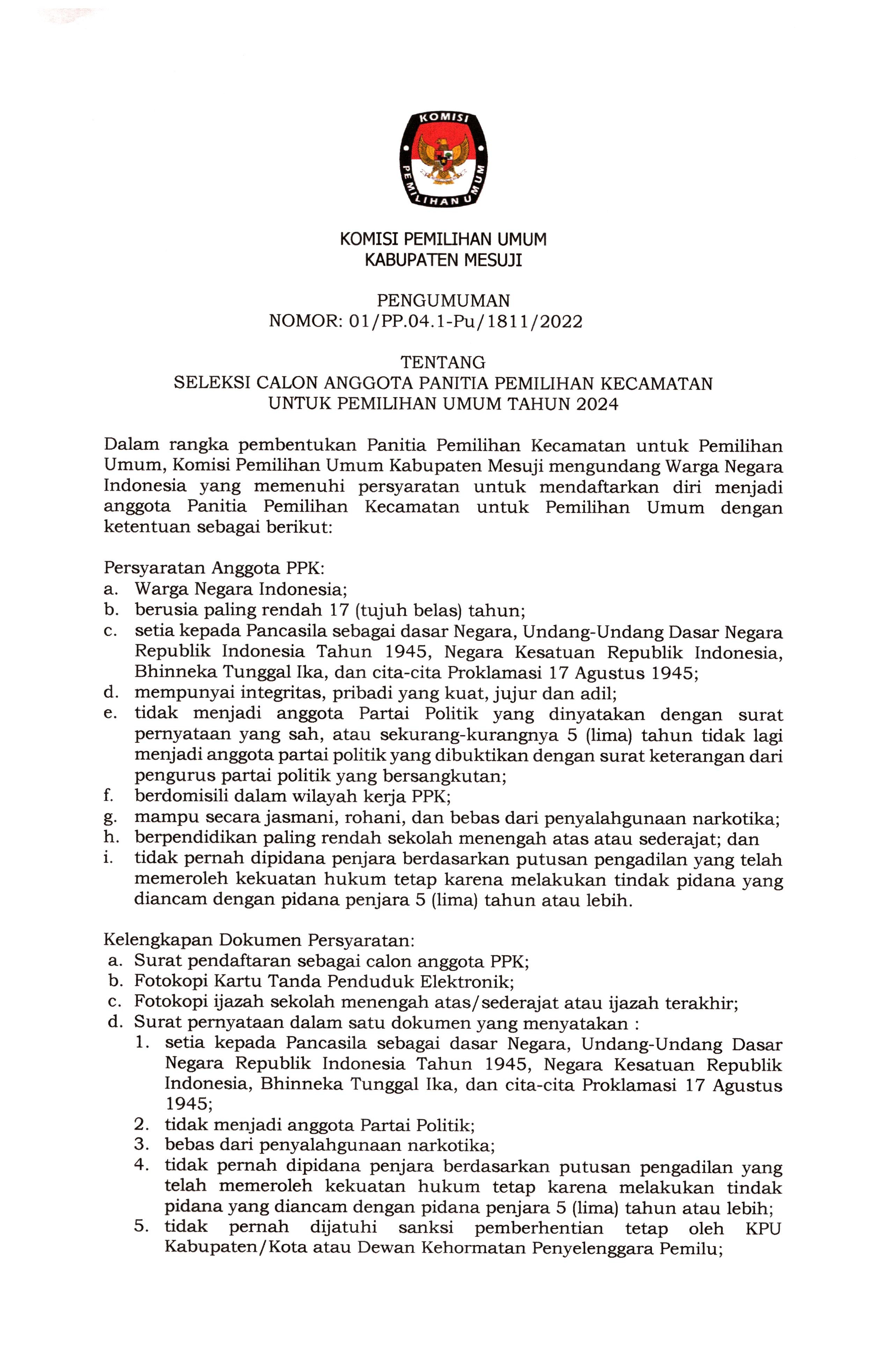PENGUMUMAN TENTANG SELEKSI CALON ANGGOTA PANITIA PEMILIHAN KECAMATAN UNTUK PEMILIHAN UMUM TAHUN 2024 Minggu, 20 November 2022 00:00 675 Download di sini Pengumuman tentang Pendaftaran Anggota PPK Bagikan: Dilihat 675 Kali.