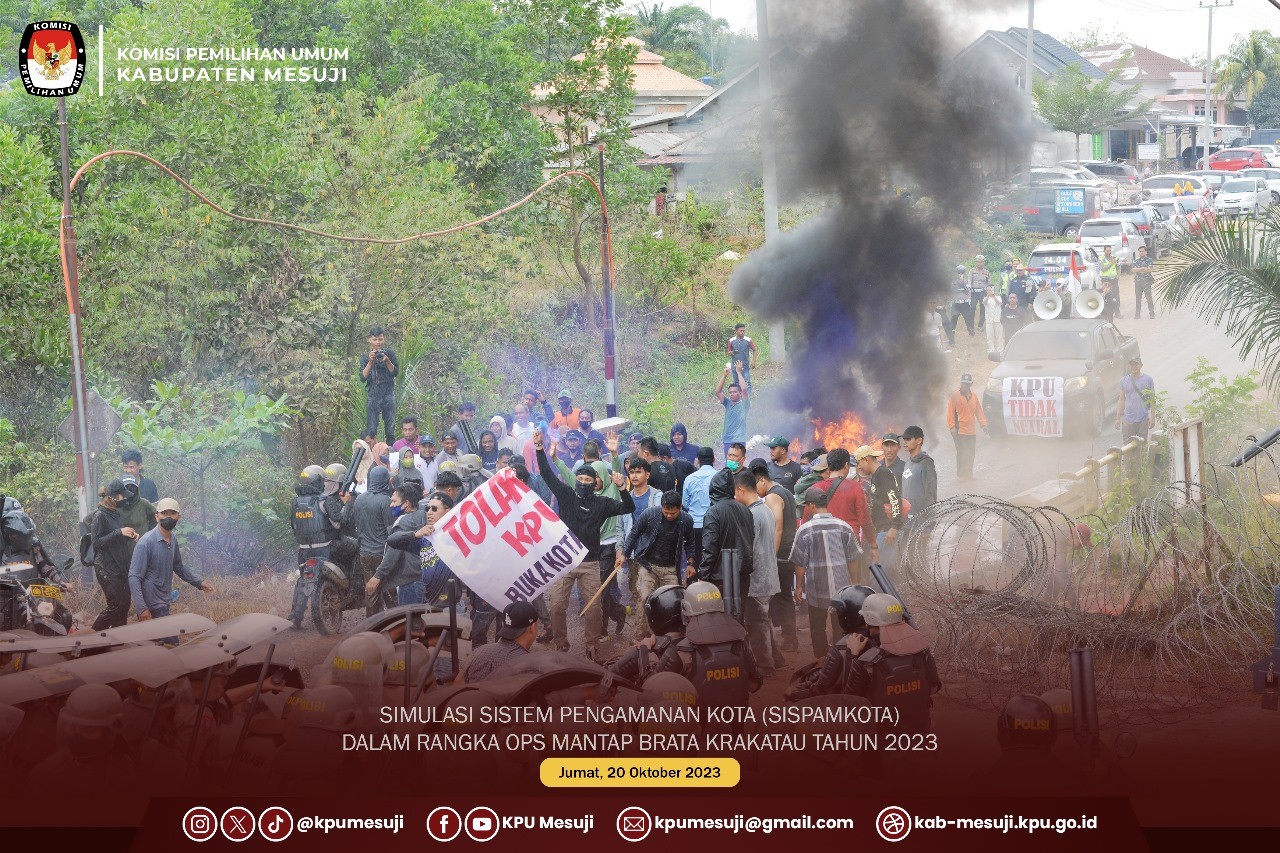 Simulasi Sistem Pengamanan Kota (Sispamkota) dalam rangka Ops Mantap Brata Krakatau – 2023 yang digelar di Kantor KPU Kabupaten Mesuji ini dihadiri oleh Ketua dan Anggota Kabupaten Mesuji, Kapolres Mesuji beserta jajaran, Dandim 0426 Tulang Bawang beserta jajaran, Forkopimda Kabupaten Mesuji, Bawaslu Kabupaten Mesuji, Kepala SKPD Se Kabupaten Mesuji, Ketua MUI, Partai Politik di Kabupaten Mesuji dan stakeholder terkait lainnya.