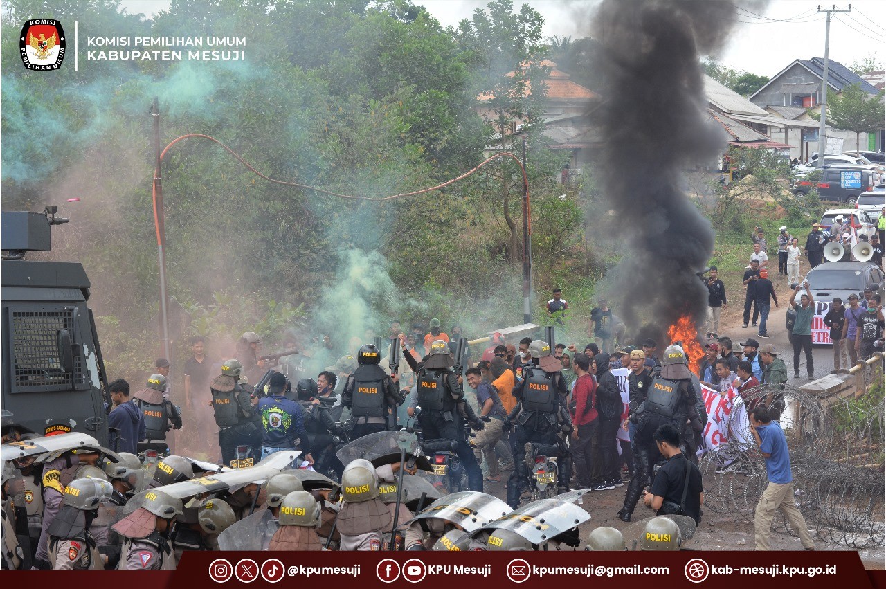 Pihak kepolisian yang melakukan pengamanan mencoba menahan massa untuk masuk ke kantor KPU. Kericuhan berlanjut dengan membakar ban dan material lainnya setelah negosiasi simpatisan dengan KPU tidak berhasil.
